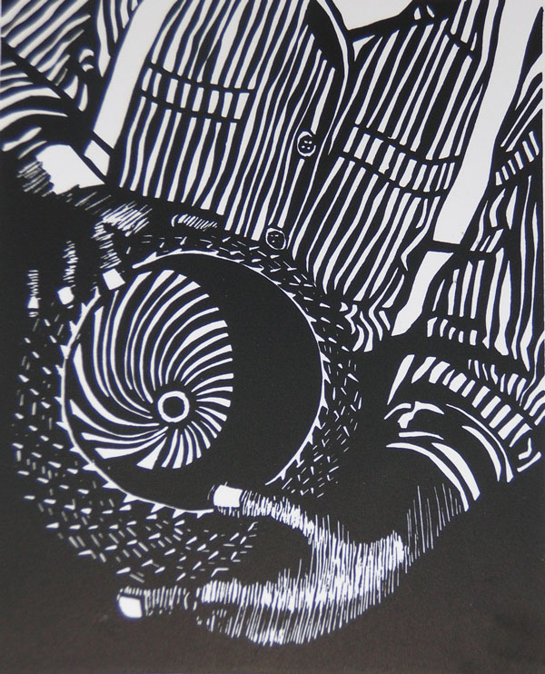 Block printing is exciting because it is a lesson in simplicity. Taking an image down to the most simple lines is often rewarding, often misleading. Being able to read a print the first time around is my goal. Not like a child’s painting, where you must say, “Tell me about this,” because you have no idea what it is supposed to be. I love it when I pull a print and hang it up for inspection and someone will say, “Hey, that’s a great cowboy!” I am experimenting with abstract geometrics inspired by the Gee’s Bend quilts. I also love fabrics and textures.