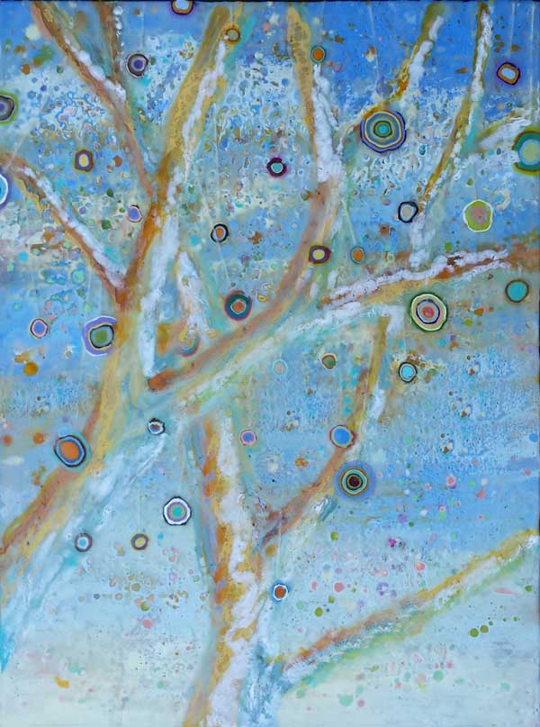 Karen works primarily in encaustic, which guides the artist to work on the canvas in a direct and flexible way. This allows for unexpected changes in composition, form, texture, and color. Layering and removal of layers keeps this process-oriented painting method archealogical in nature, as there is much digging back into and revealing the often forgotten history of the painting. A certain non-attachment to the current phase of the painting develops, and allows for a freedom not experienced in other media.